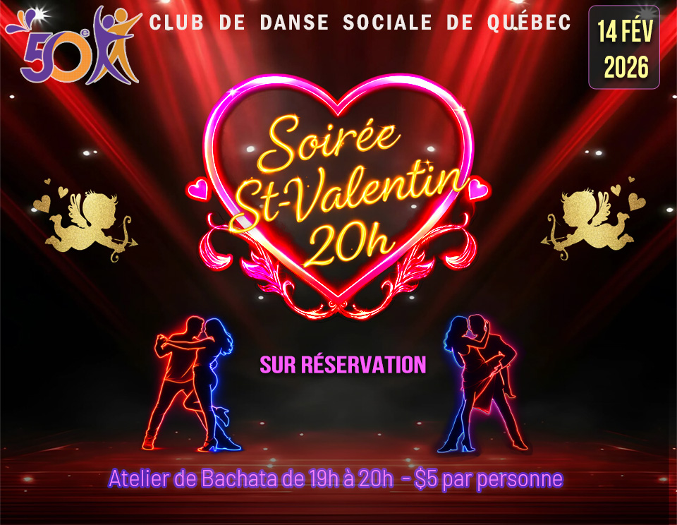 Soirée Saint-Valentin – Club de danse sociale de Québec – 14 février La plus belle salle de danse sociale à Québec Veuillez SVP réserver d’avance afin